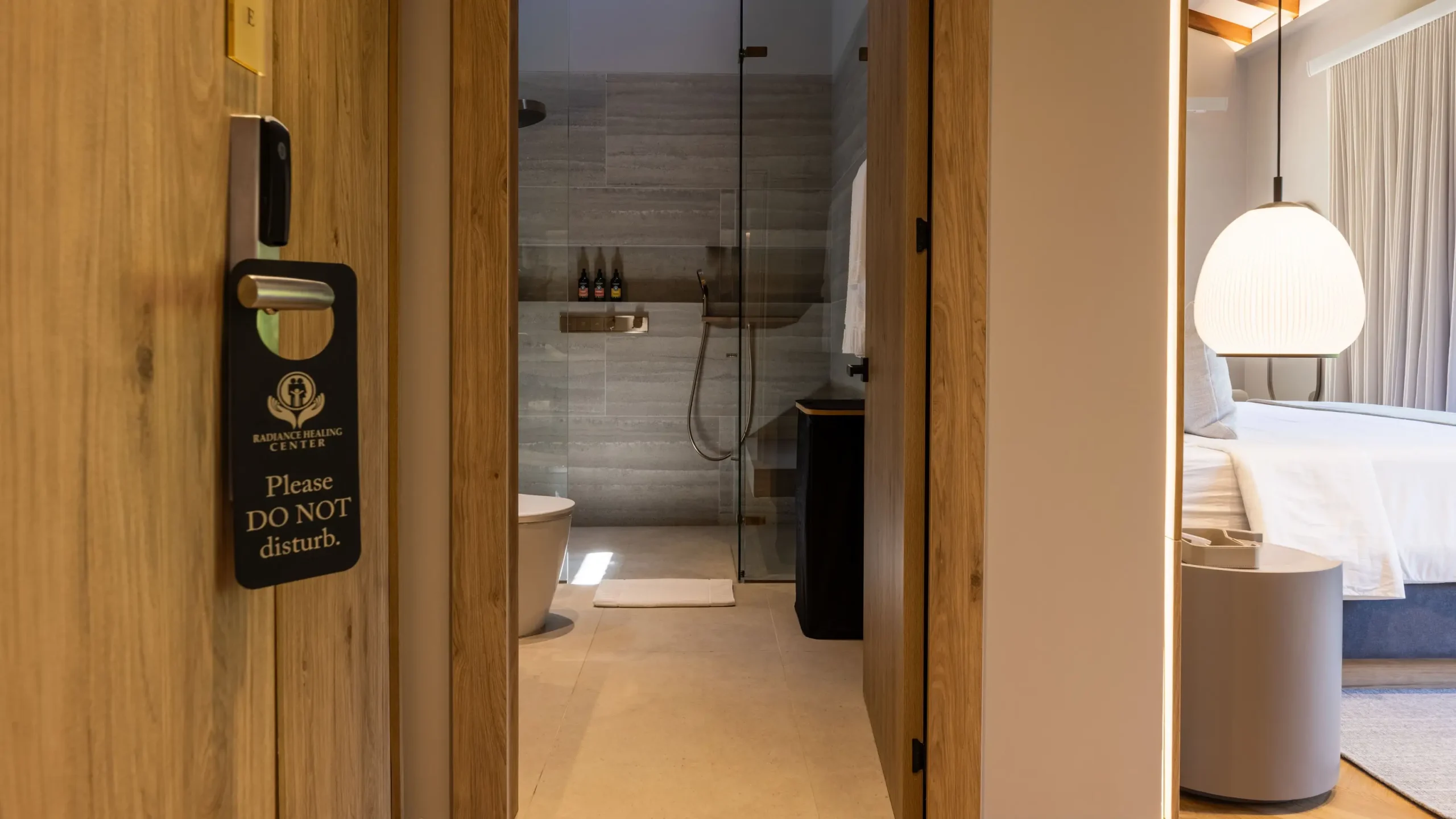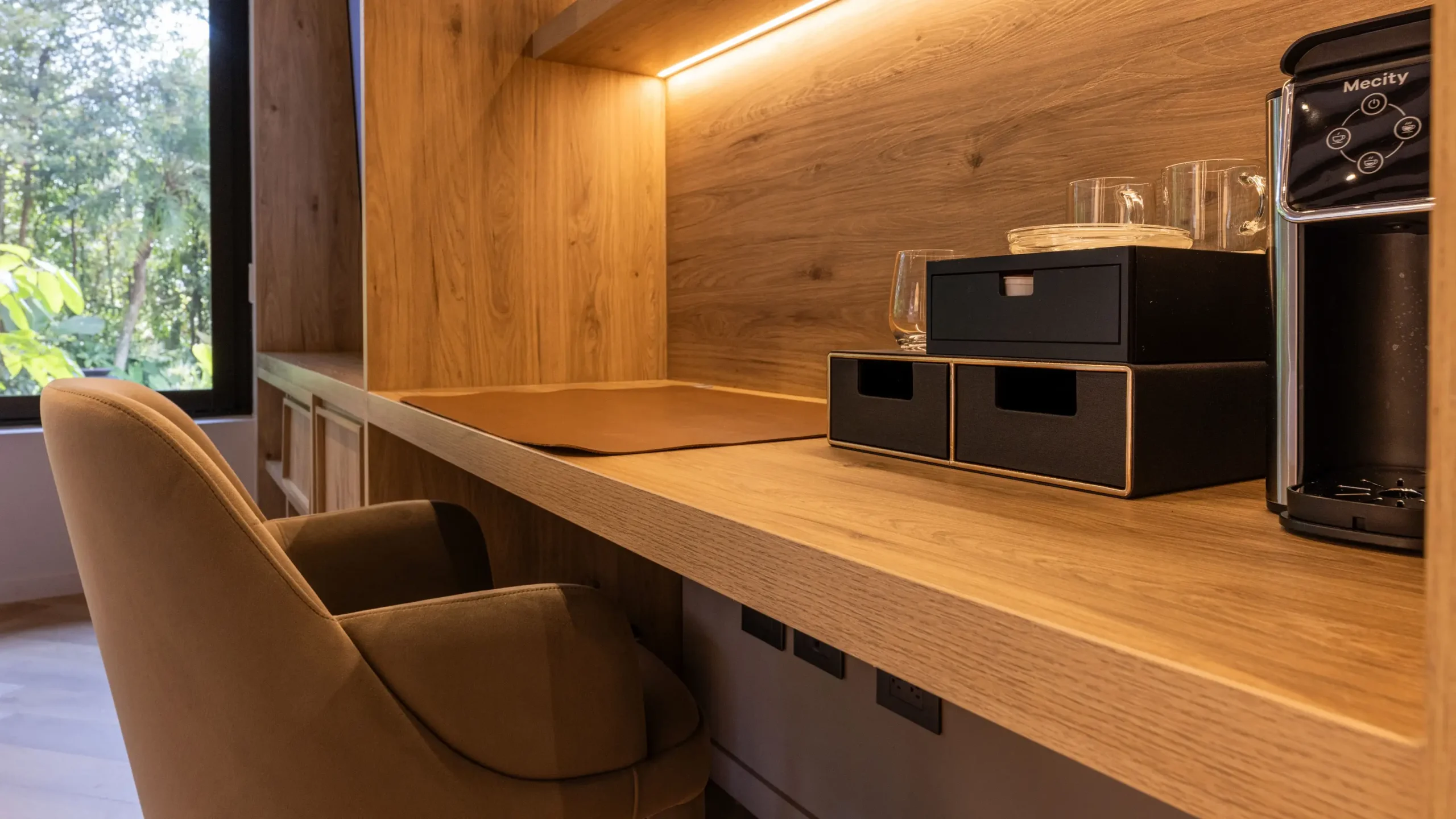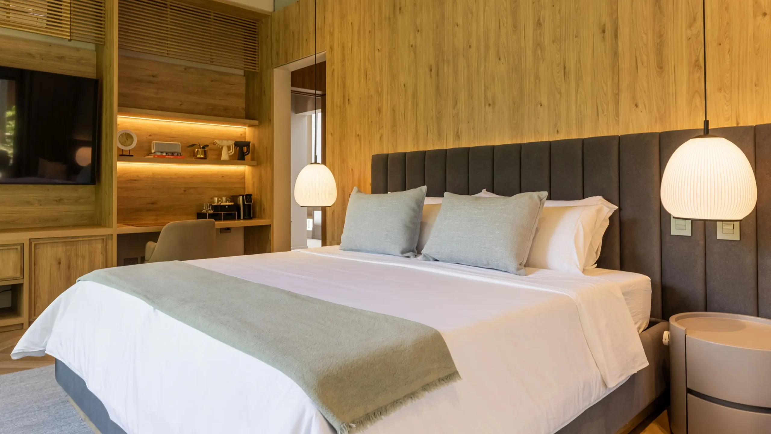 The suite features a reclining King bed for deep and restorative rest. Adjustable lighting allows guests to personalize the atmosphere according to their needs, creating a warm and cozy environment.