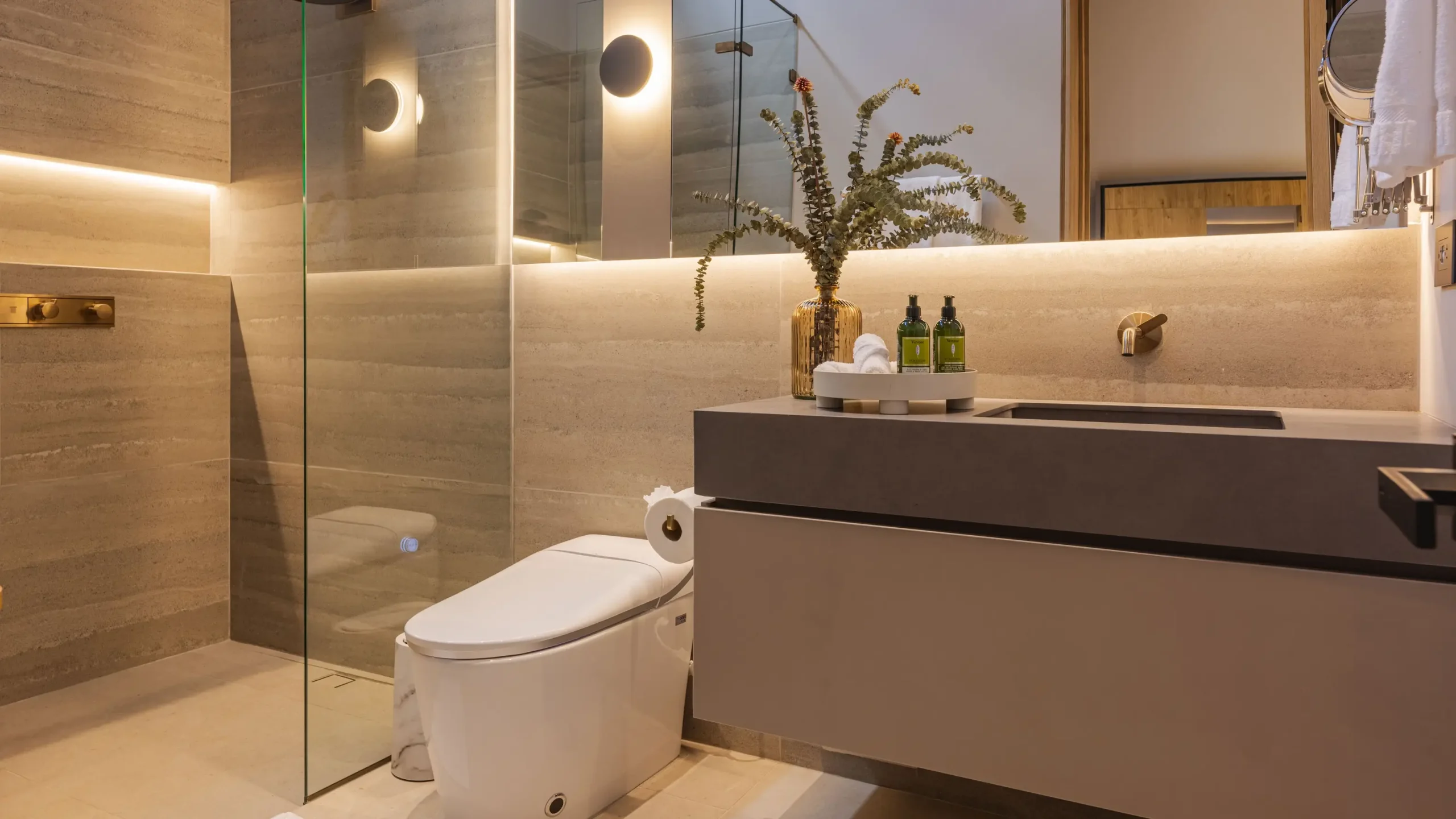 The private bathroom has been carefully designed with a smart toilet, adding an advanced level of comfort and functionality.