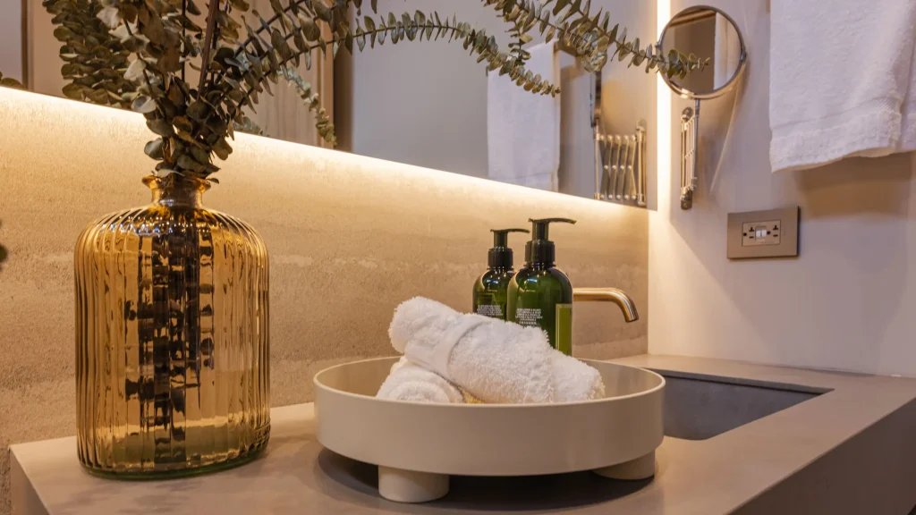 The reclining King bed ensures restorative sleep at any time of the day. Adjustable lighting creates a cozy and personalized atmosphere according to each guest’s mood.