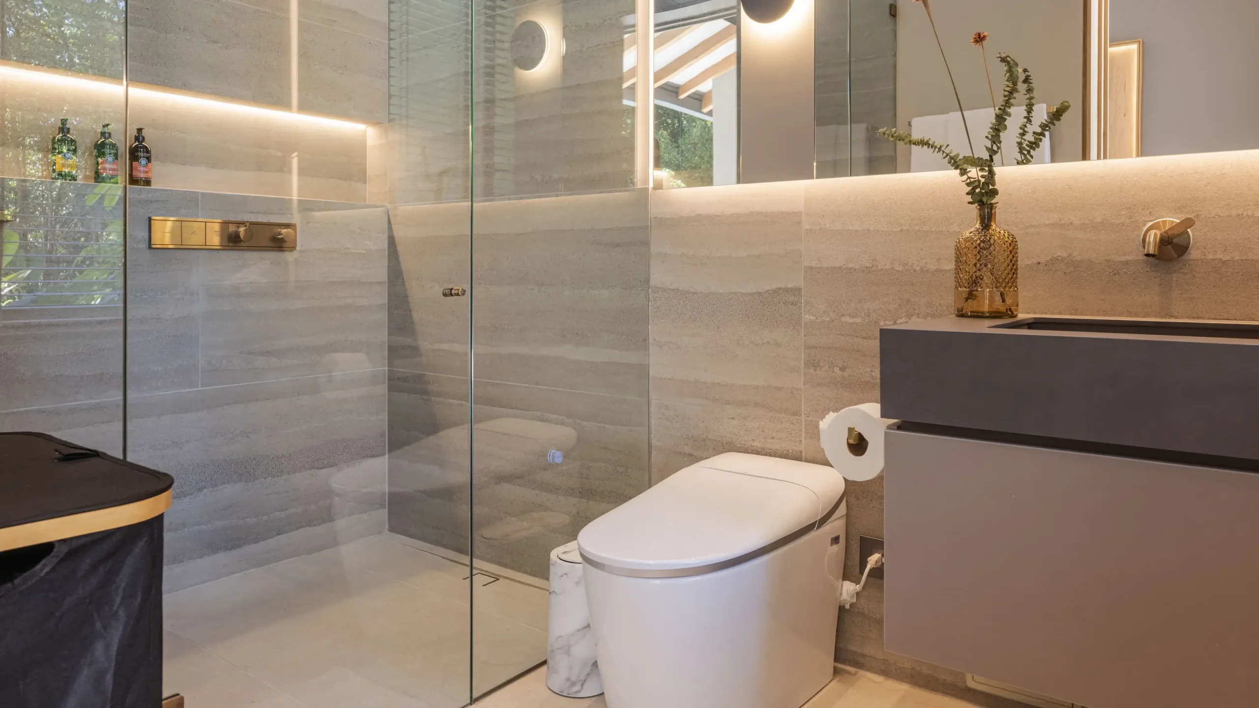 The private bathroom is spacious and functional, featuring a smart toilet that enhances comfort and technology.